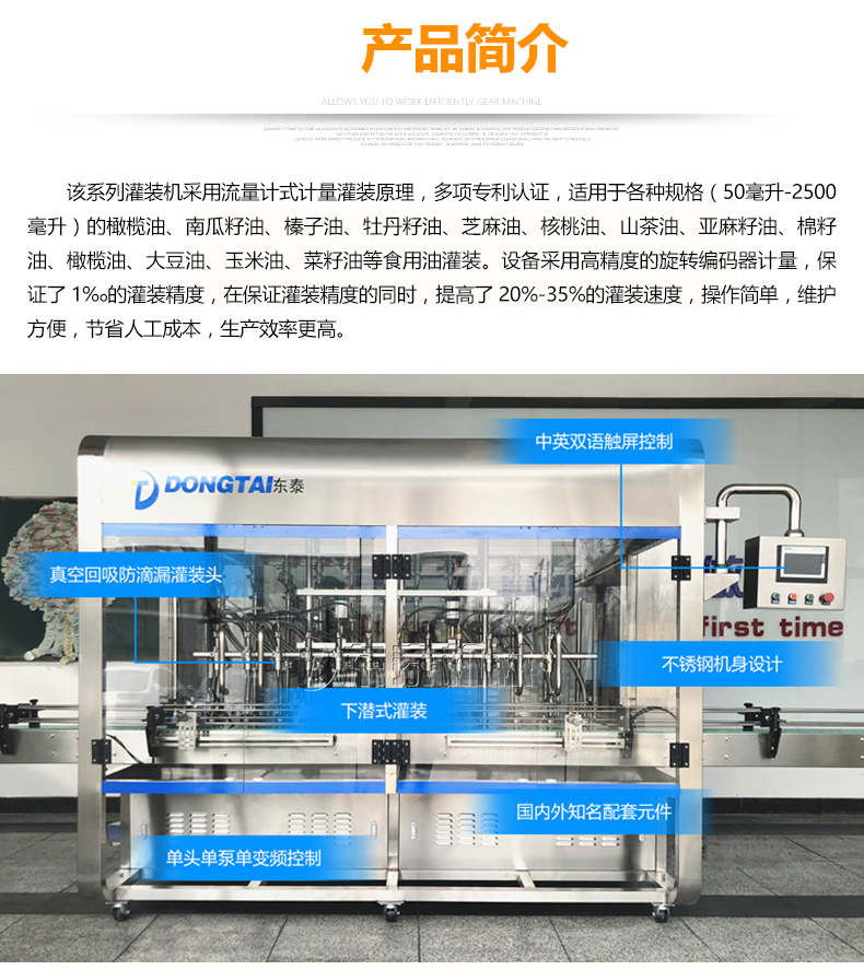 這款食用油灌裝機(jī)應(yīng)用的是流量計式計量灌裝的原理,榮獲了多項認(rèn)證資格,可適用各種容量(1-5升)的南瓜籽油、榛子油、牡丹籽油、芝麻油、核桃油、山茶油、亞麻籽油、棉籽油、橄欖油、大豆油、玉米油、菜籽油等多種食用油的灌裝。這個食用油選用了高精的旋轉(zhuǎn)編碼器計量,使灌裝精度保持在了1%o,在保證樂灌裝誤差的同時,提高了20%-35%的灌裝速率,使用方便,維護(hù)便捷,減少了一部分的人工成本,使生產(chǎn)效率提升。除了進(jìn)桶時間,6頭灌裝機(jī),變頻器在25赫茲的速率進(jìn)行下,每組灌裝的時間為16秒,1350桶/小時;